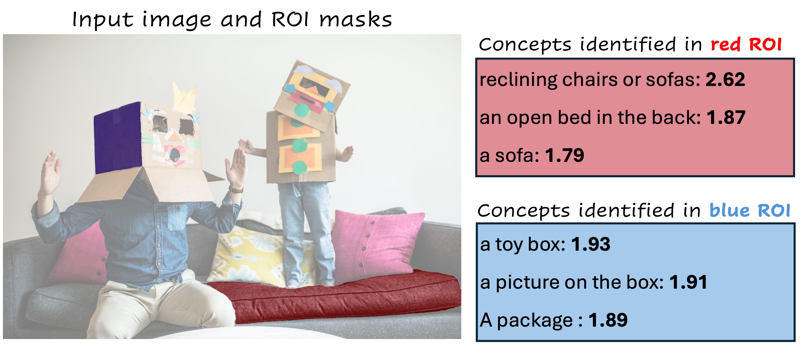 When prompted with a specific image region, SALF-CBM reveals how the model perceives it by identifying the most strongly activated concepts within that region. Below, we show qualitative examples with ResNet-50 backbone pre-trained on ImageNet.